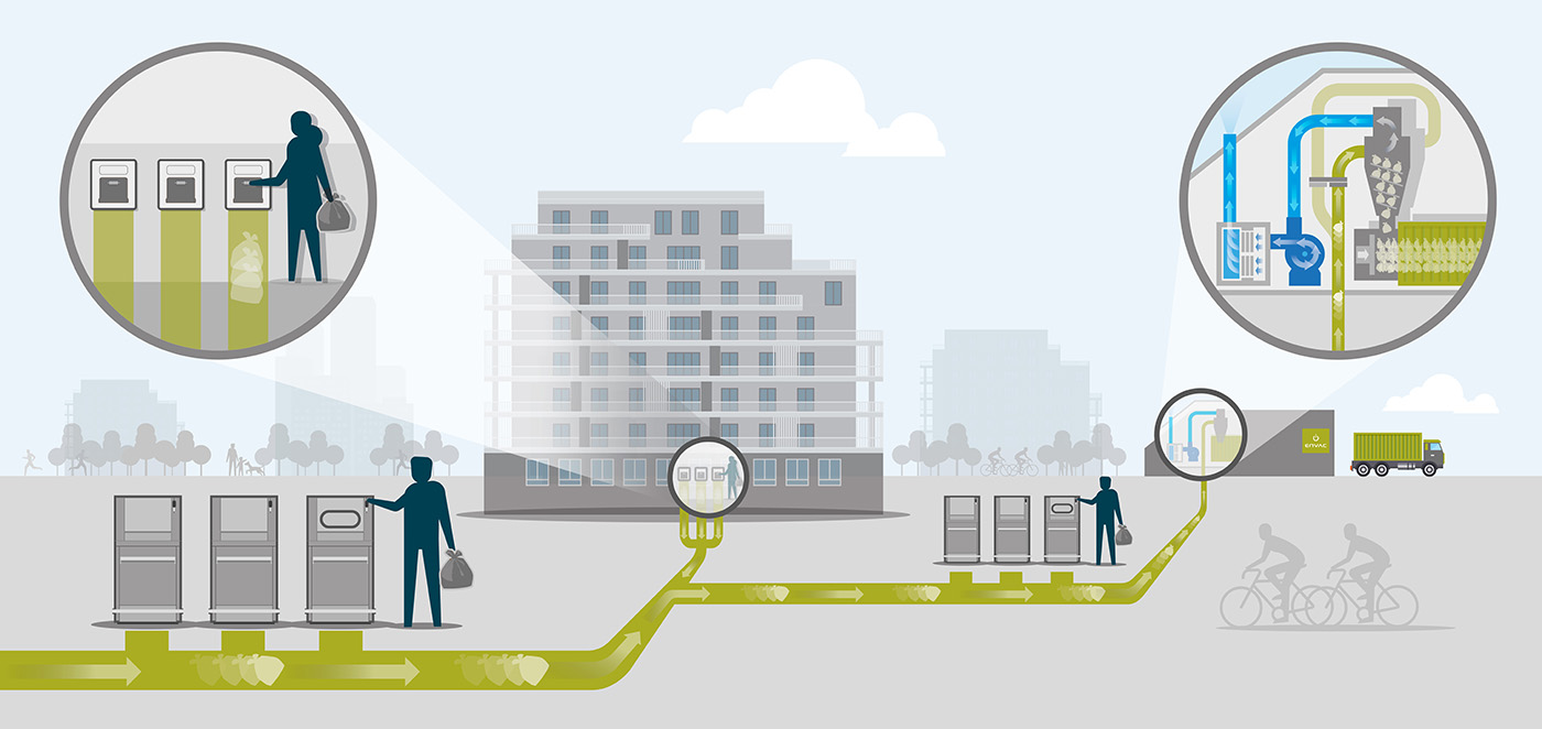 Las bolsas se transportan hasta la central de recogida ENVAC impulsadas por una corriente de aire, a través de una red de tuberías subterráneas (3) y a una velocidad de 70 km/h.