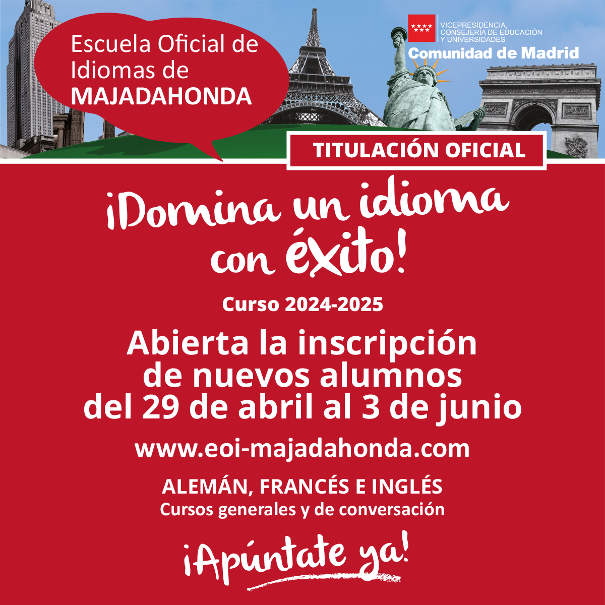 Abierto el plazo de Inscripción en la Escuela Oficial de Idiomas de Majadahondade para nuevos Alumnos del 29 de abril al 3 de junio de 2024 para el curso 2024-2025 de los idiomas Alemán, Francés e Inglés. Titulación Oficial de la Comunidad de Madrid.