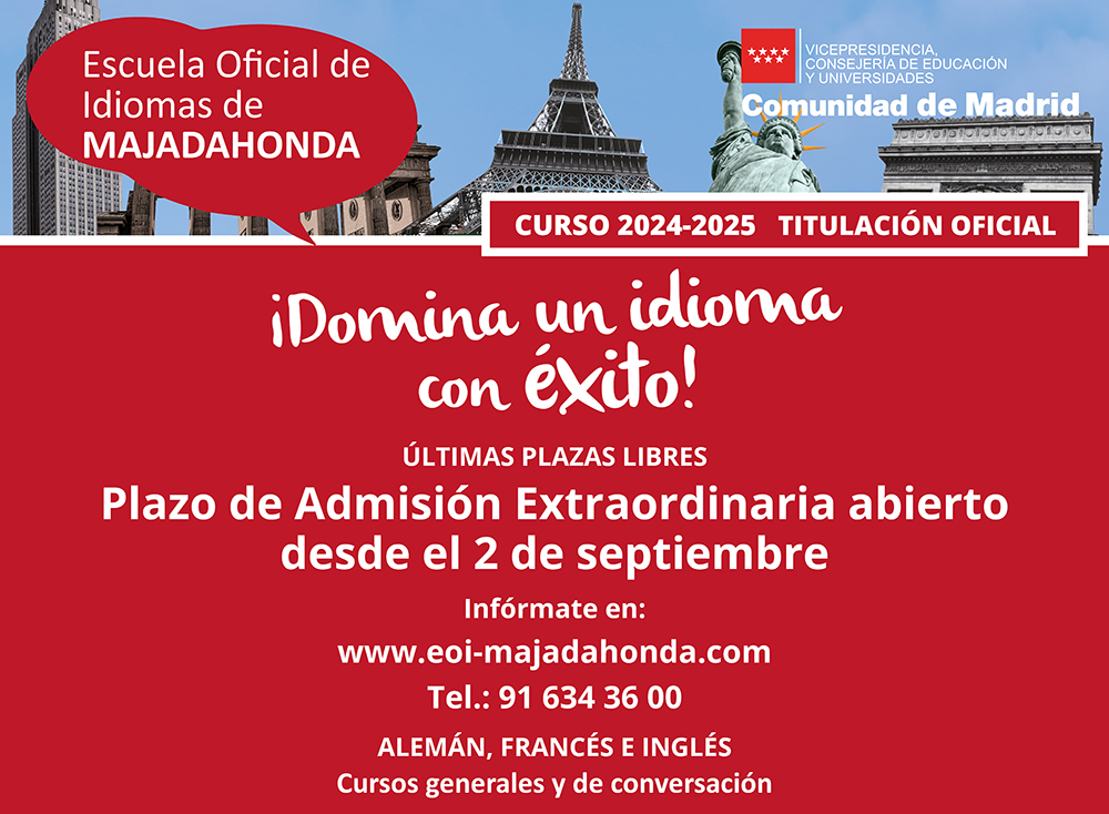 Abierto el plazo de Admisión Extraordinario para el curso 2024-2025 desde el 2 de septiembre de los idiomas Alemán, Francés e Inglés.