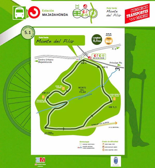 Ruta circular por el Monte del Pilar (6.5 km). Se trata de un programa realizado por el Consorcio Regional de Transportes de Madrid para fomentar el ocio sostenible con rutas para caminar y pedalear y que se pueden comenzar y finalizar en una estación de la red de transporte público.