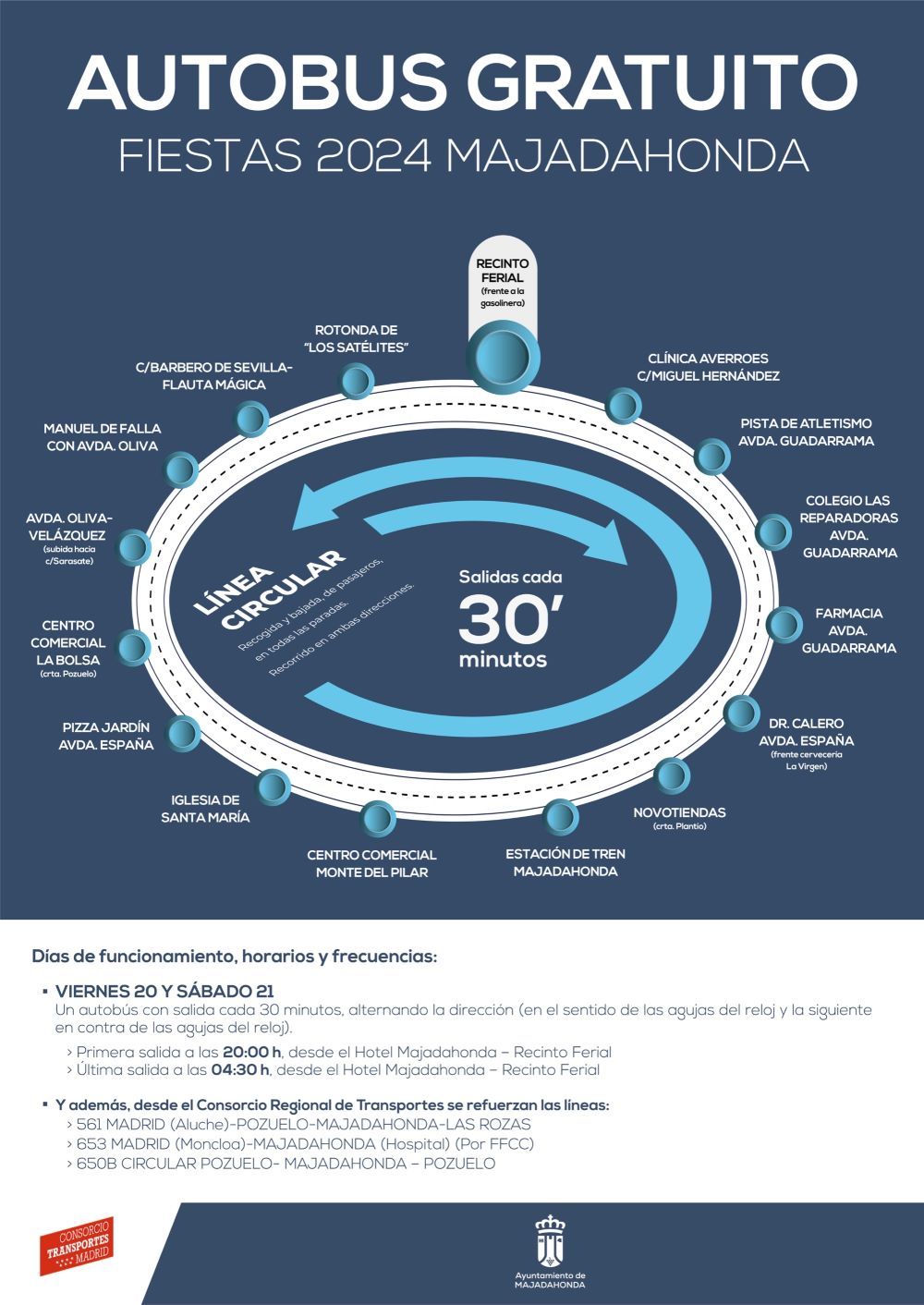 Los autobuses son completamente gratuitos y tendrán una ruta circular, en ambas direcciones, con una frecuencia de paso de 30 minutos. El primero de estos servicios especiales comenzará a las 20 horas de hoy y finalizará a las 04.30 horas, con paradas en la Rotonda de los Satélites; calle Barbero de Sevilla con Flauta Mágica; calle Manuel de Falla con avenida Oliva; avenida de la Oliva con Velázquez; centro comercial La Bolsa; Pizza Jardín-avenida de España; iglesia de Santa María; centro comercial Monte del Pilar; estación de tren Majadahonda; Novotiendas (carretera de El Plantío); Doctor Calero con avenida de España; farmacia avenida de Guadarrama; colegio Las Reparadoras en avenida de Guadarrama; pista de atletismo en avenida de Guadarrama; Centro Médico Averroes en la calle Miguel Hernández y Recinto Ferial. Es aquí donde están previstas hoy las actuaciones del reconocido dúo madrileño Camela (a las 22 horas) y, con posterioridad, de DJ Nano, DJ Sergio González y Lolo&Kiko Clubbing.