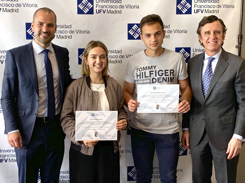 El primer edil felicitó a los estudiantes que van a cursar Gastronomía y Ade, en el caso de Laura, y Biomedicina y Experto en Emprendimiento de Proyectos, en el caso de Alejandro y que contarán con la exención del 90% del coste total de las mensualidades durante el primer año. “Es un orgullo tener alumnos como vosotros y esta beca es un premio a vuestro esfuerzo. Os deseo mucha suerte en vuestra formación en un excelente centro como es la Universidad Francisco de Vitoria”.