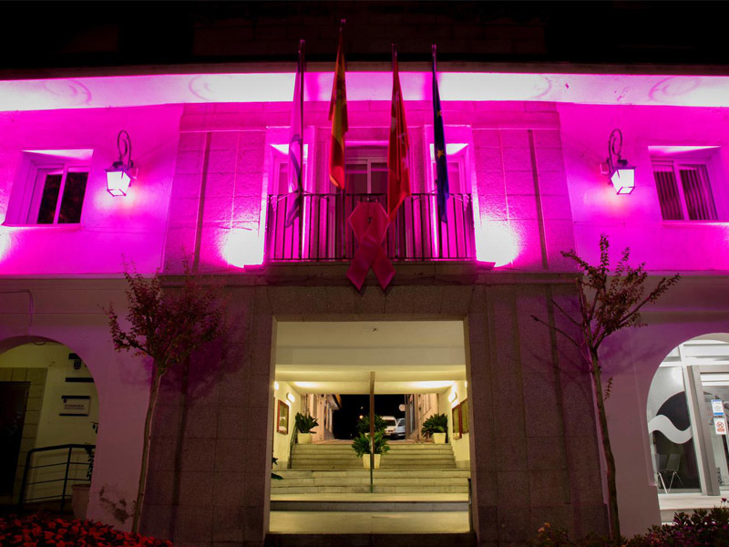 La fachada del Ayuntamiento de Majadahonda se iluminará de rosa por primera vez y durante todo el fin de semana con motivo del Día Mundial contra el cáncer de mama que se celebra el 19 de octubre. El alcalde, José Luis Álvarez Ustarroz, junto a la presidenta de la AECC en Majadahonda, Dulce Martín, han asistido al encendido de los focos y han colgado también del balcón principal del Consistorio, un gran lazo rosa para conmemorar esta fecha.