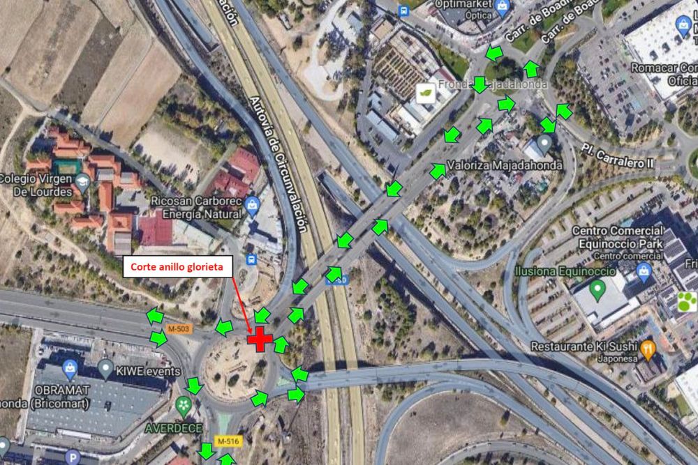 Tras el periodo navideño, las obras de la pasarela peatonal que se está construyendo en Roza Martín entran en una nueva fase en este recién arrancado 2024. Desde este lunes 8 de enero y, previsiblemente, hasta finales de marzo se va a proceder de nuevo a regular el tráfico de manera diferente al habitual modo en las rotondas ubicadas antes y después del puente que cruza la M50 y conecta el centro de Majadahonda con las carreteras M503 y M516. Concretamente, ambas rotondas dejarán de prestar servicio circular individual de redistribución del tráfico y pasarán a formar un círculo único de tráfico entre ambas. Para ello, se procederá a cortar el giro completo en la rotonda ubicada junto al colegio Virgen de Lourdes. Los vehículos que necesiten hacer el giro completo en esta rotonda lo podrán seguir haciendo en todo momento, pero a través de la rotonda ubicada al otro lado de la carretera M50.