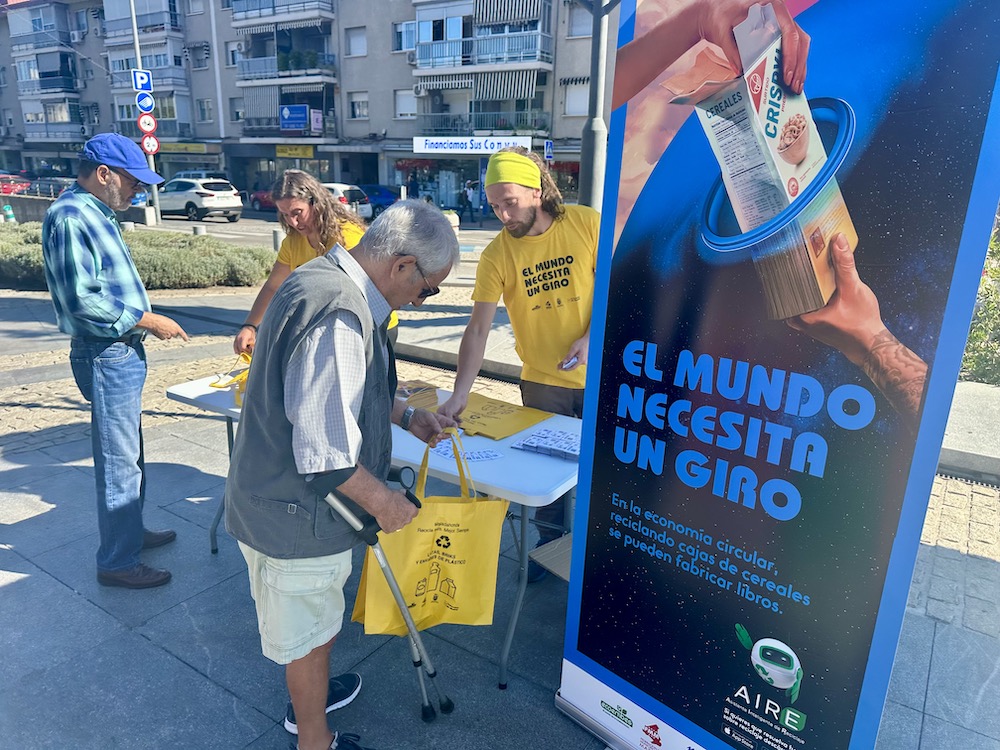 La carpa informativa incluye dos elementos gráficos que ayudan de manera visual a ver el paso de un residuo a un nuevo producto. Asimismo, los informadores entregan una octavilla explicativa bajo el título “El mundo necesita un giro” a cada ciudadano que detalla el correcto uso de los contenedores. Además, se les hace entrega de una bolsa elaborada a partir de plástico impermeable reciclado que detalla un listado de productos que han de desecharse en el contenedor amarillo, y otro modelo equivalente con el contenedor azul. También se hace entrega de un imán que detalla los canales para poder conectar con un asistente virtual del reciclaje llamado “AIRE” y así poder resolver cualquier duda que surja en los hogares sobre dónde depositar un residuo.