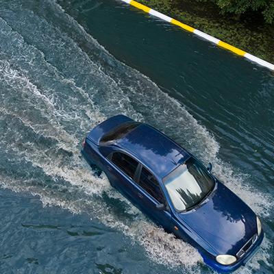 No debe cruzar terrenos inundados jamás en automóvil. Si aún puede cruzarlo, recuerde que debe cruzarlo en velocidad corta, y avanzando muy despacio para que el agua no salpique el motor y pueda pararlo. Los frenos no funcionan bien si están mojados, por lo tanto, compruébelos varias veces después de cruzar.