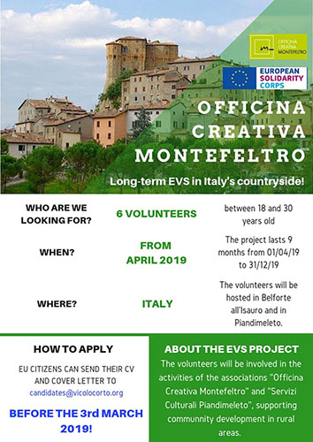 "ESC in Montefeltro", que acogerá a 6 voluntarios/as en los municipios rurales de Belforte all´Isauro y Piandimeleto, desde el 01/04/2019 hasta el 31/12/2019 (9 meses).