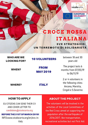 "SVE Strategico: Un Terremoto di Solidarietà", que acogerá 12 voluntarios/as en diferentes comités locales de la Cruz Roja, desde el 07/05/2019 hasta el 06/11/2019 (7 meses).
